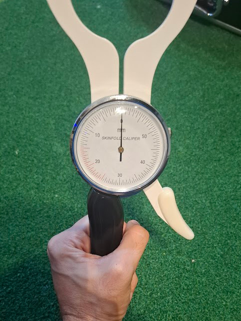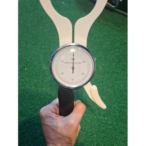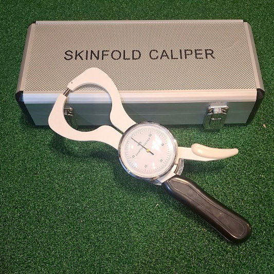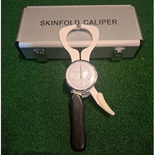 A premium body fat skin fold caliper, made from stainless steel and aluminum, weighing 1.5kg and coming in a padded carry case.
