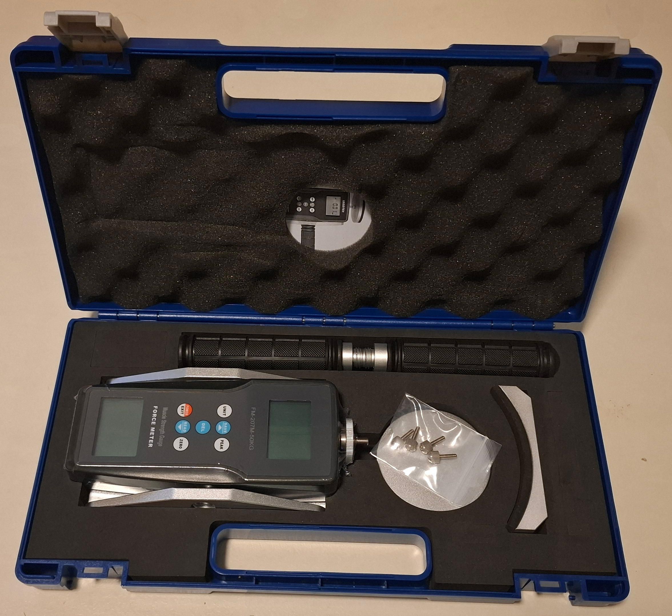 สิ่งที่รวมอยู่ในชุด เครื่องวัดแรงดึง, โครงโลหะพร้อมที่จับ, อุปกรณ์เสริม 2 ชิ้น (ไม่รวมแบตเตอรี่ AA 2 ก้อน) + กระเป๋าพกพาป้องกัน